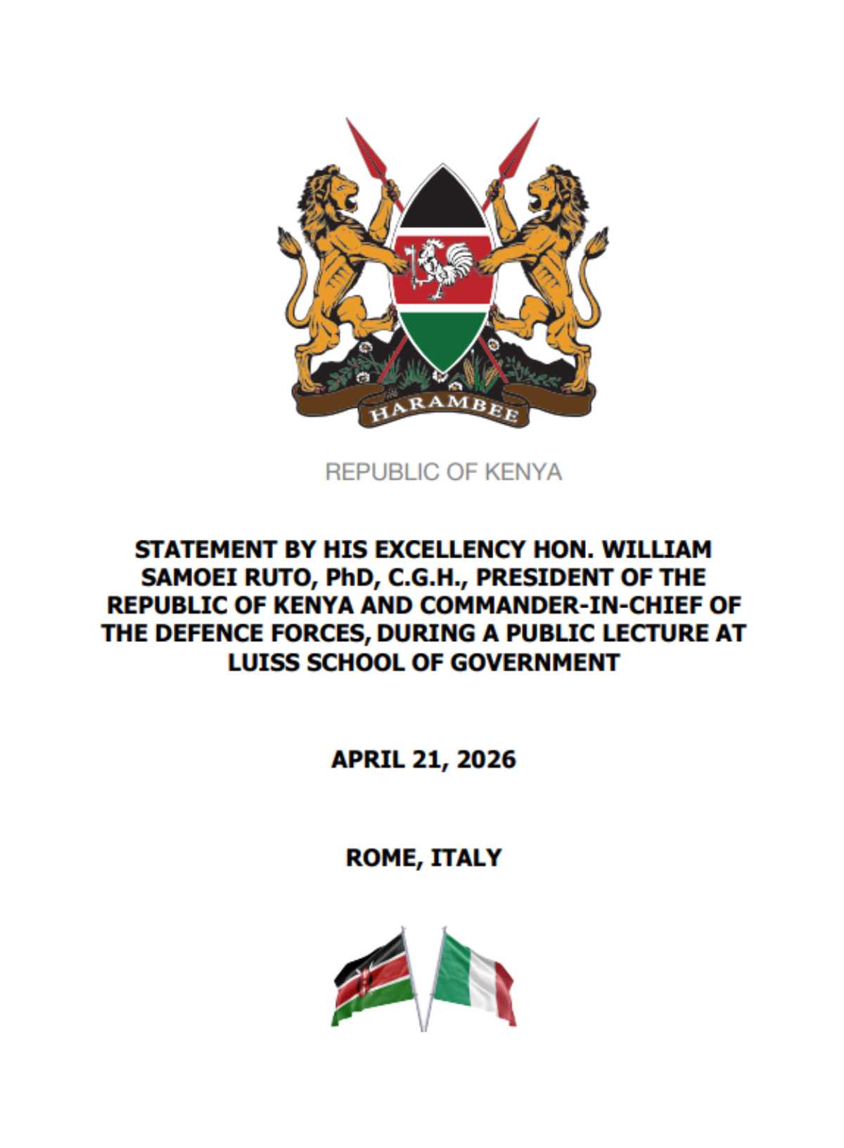 Full statement by His Excellency Hon. William Samoei Ruto, Phd, C.G.H., President of the Republic of Kenya and Commander-In-Chief of the Defence Forces, during a public lecture at Luiss School of Government April 21, 2026 Rome, Italy